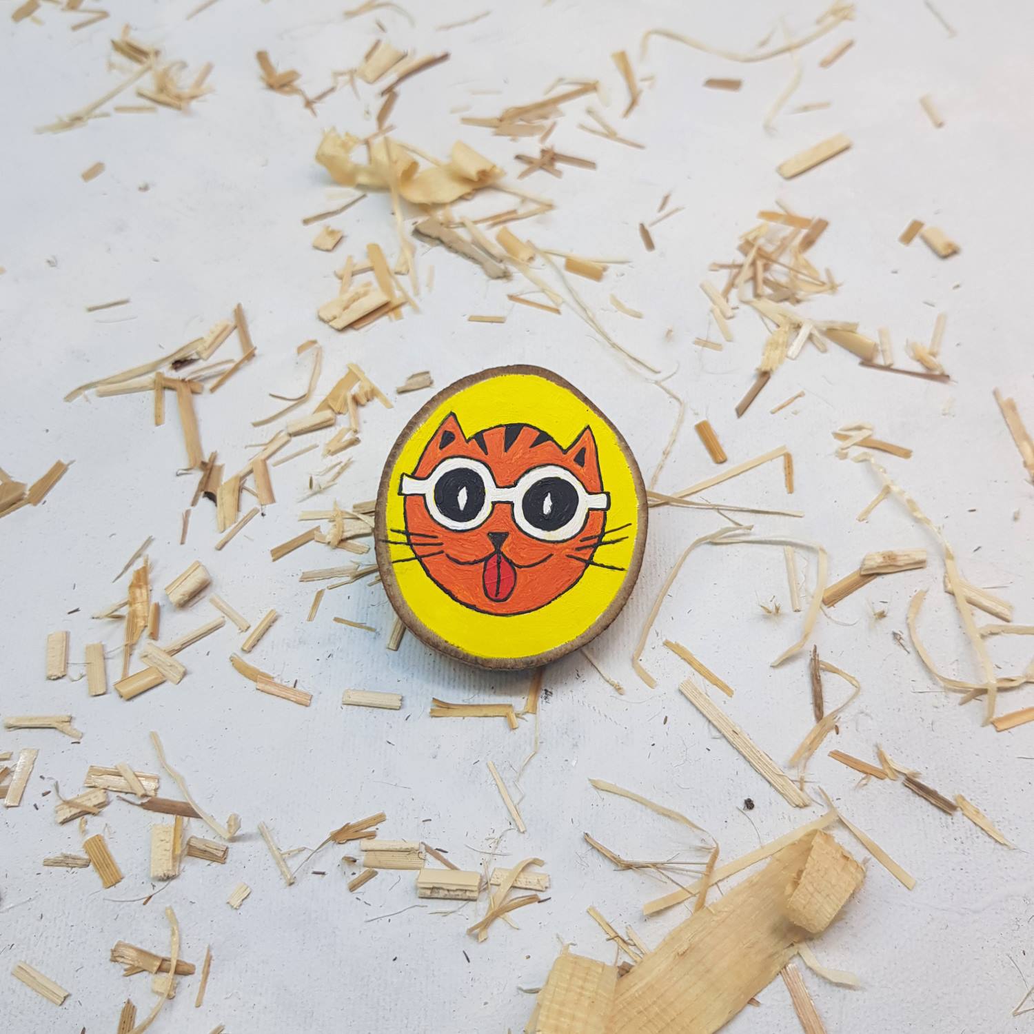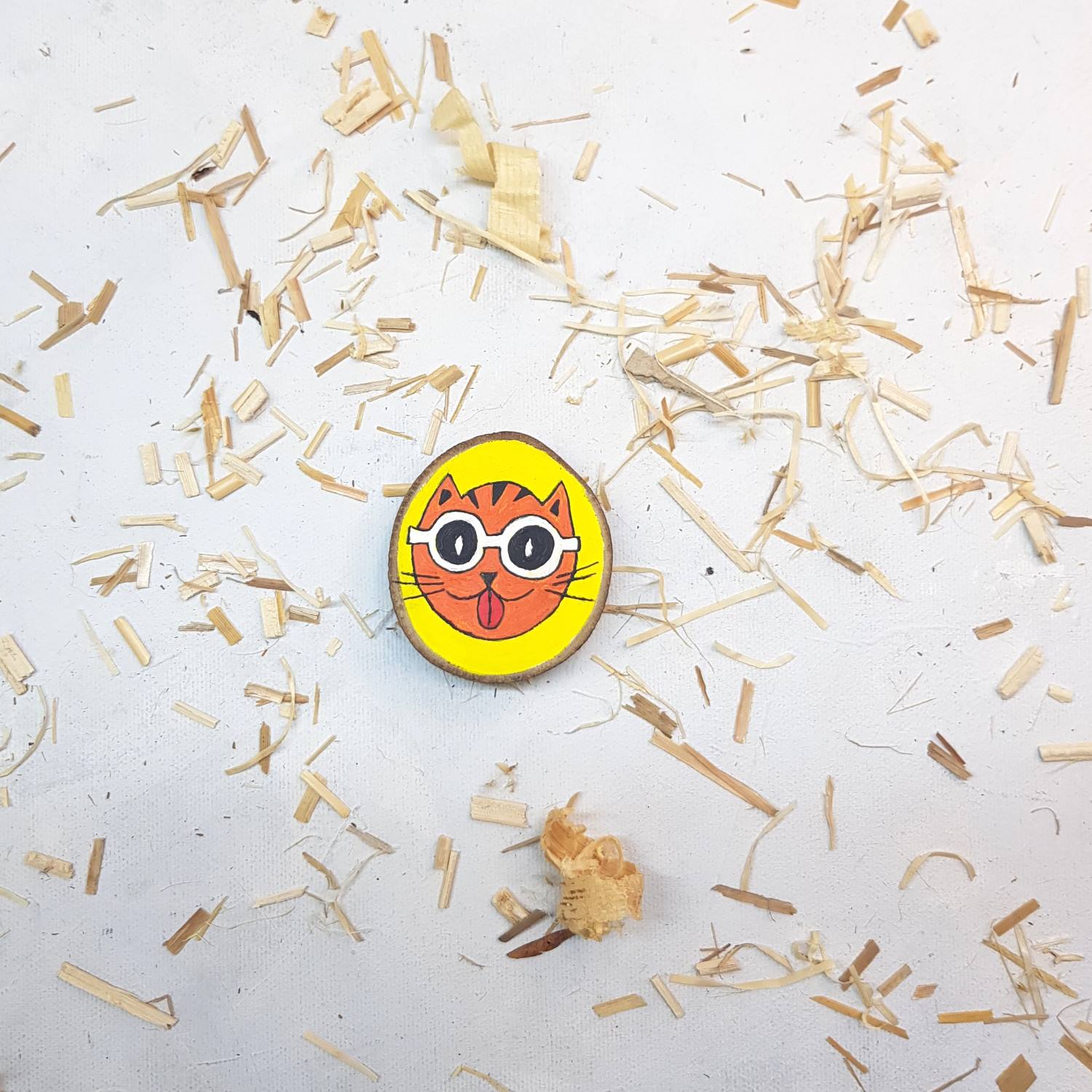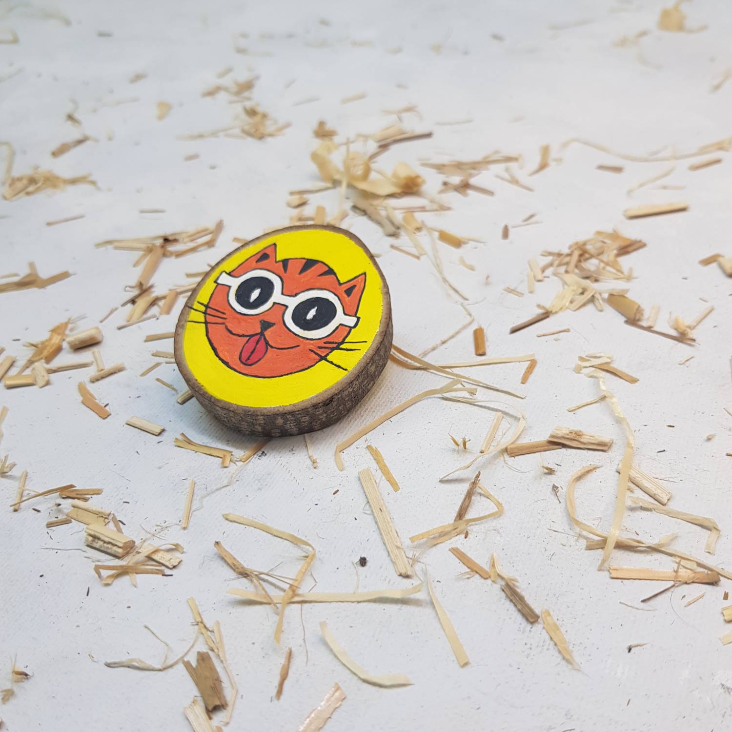 Smeško je zabaven, unikaten in smešen lik – glava muce z očali, naslikana na leseni podlagi z akrilnimi barvami… nepravilni krog debeline cca 1 cm, premera cca 5.5 cm , z lubjem.