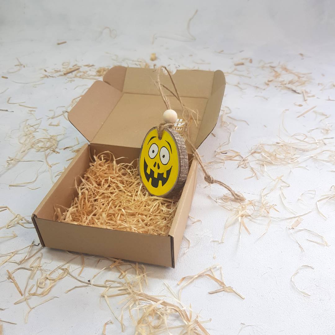 Smeško je zabavna, unikatna in smešna faca, ročno narisana na lesenem krogcu z akrilnimi barvami. Kolobar je nepravilne oblike, debeline 1 cm, premera cca 7 cm, z lubjem ob strani. Z vrvico je primeren za obešanje kjerkoli si želiš…